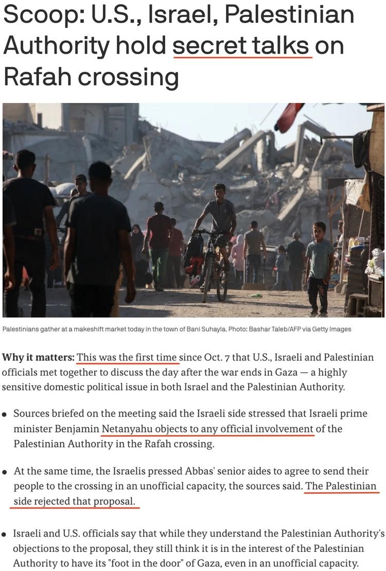 有消息说,近日以色列、美国和巴勒斯坦民族权力机构三方代表举行了秘密会谈,就拉法口岸控制权以及加沙战后治理等问题进行磋商,这是自去年10月7日本轮巴以冲突爆发后,三方首次举行会谈。