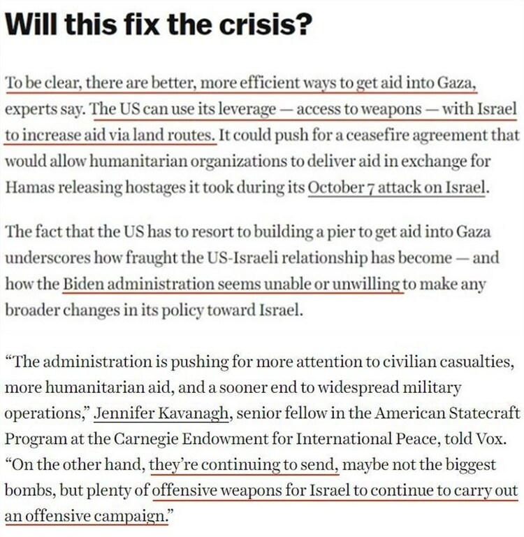 美国沃克斯新闻网援引分析人士的话报道称,美国可以利用其对以色列的影响力施压要求通过陆路增加援助。它可以推动达成一项停火协议,允许人道主义组织提供援助。然而,美国不得不通过修建码头来向加沙运送援助物资,这凸显了美以关系已经变得多么令人担忧,美国政府似乎无法或不愿对其以色列政策做出任何改变。