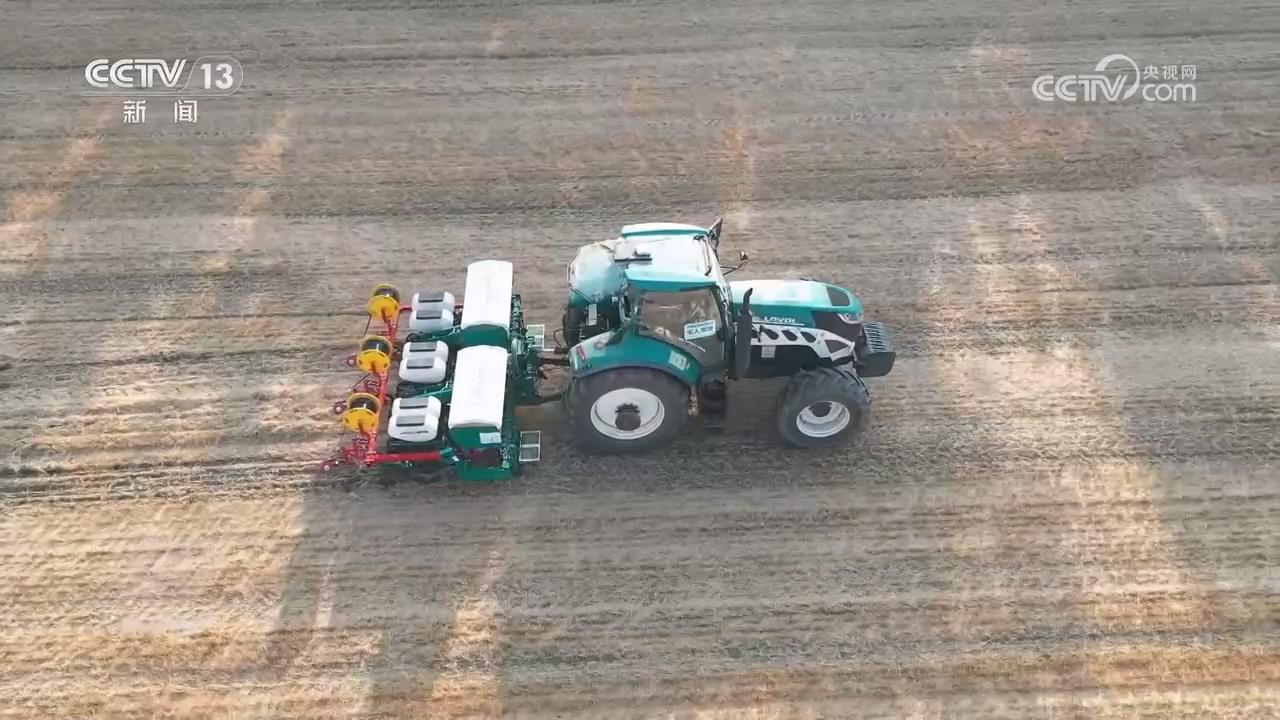 通过北斗卫星导航的辅助,这款播种机可以精准按照设定的行距和株距,一次性完成播种、施肥、铺设滴灌带等多个工序的作业,大大提高了作业效率。用这种高性能播种机可以做到精准密植,将播种量从以前每亩4200株提高到6000株。