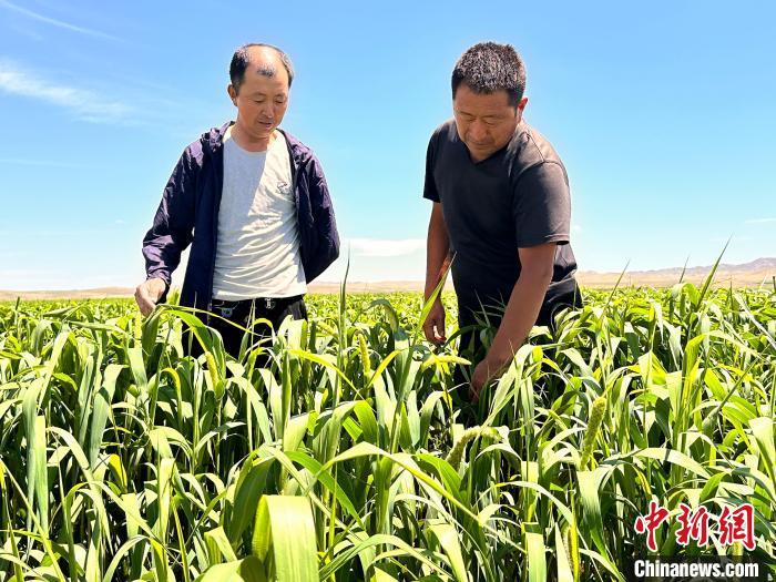 图为任俊(右)查看谷子出穗情况。 李荣摄