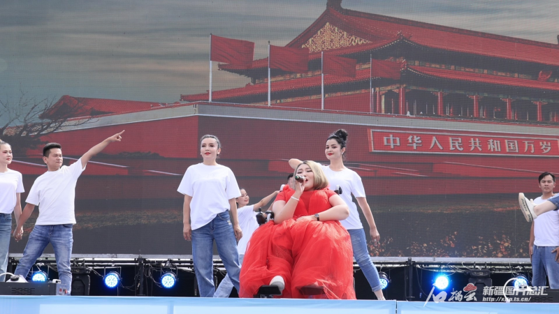 在第十届玛纳斯国际文化旅游节上,阿亚提汗身着一袭鲜艳的红裙,如同晨曦中的第一缕阳光,她以饱满的热情献唱:“黎明苏醒在巍峨东方,东方,北京升起火红的太阳,火红的太阳……”
