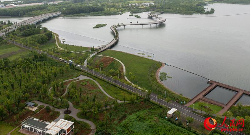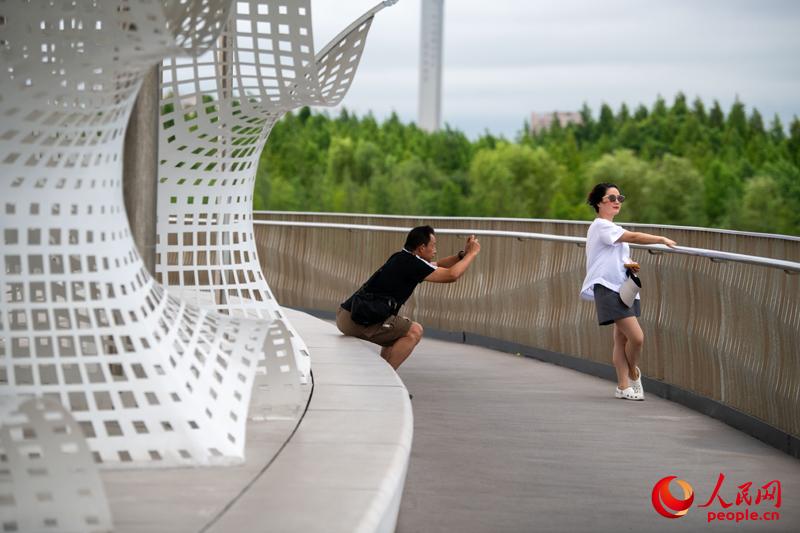 市民在元荡慢行桥上拍照打卡。人民网记者 翁奇羽摄