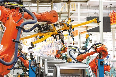 近日,河南省安阳市一家新能源汽车企业生产车间内,工业机器人按照程序指令完成自动作业。
