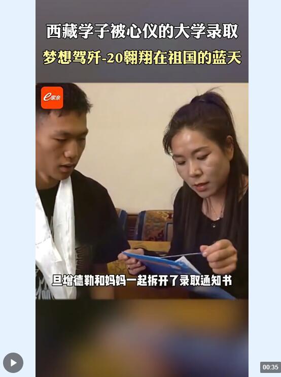 7月19日,就读于拉萨江苏实验中学的旦增德勒收到了中国人民解放军空军航空大学的录取通知书,他是今年全区唯一一个被该大学录取的藏族学子。旦增德勒表示,他的梦想是开着歼-20在祖国的天空上翱翔。