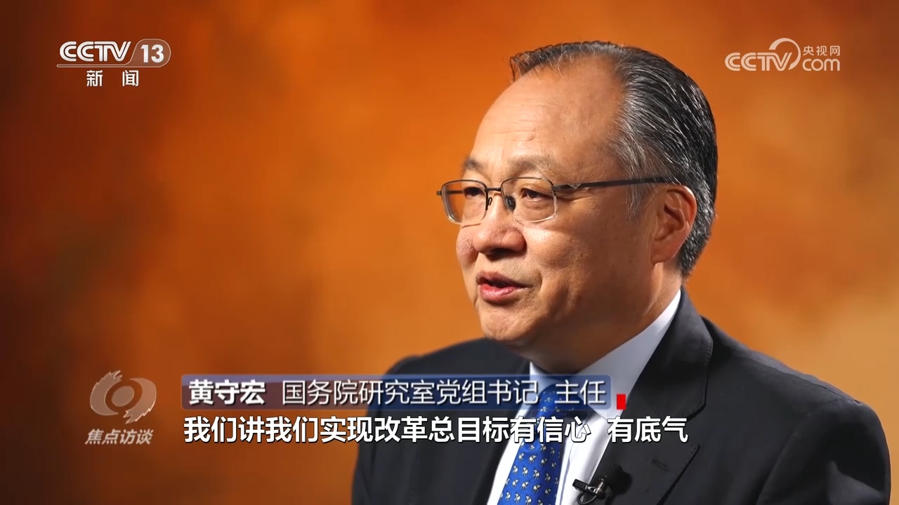 黄守宏:“在进一步全面深化改革总目标中,明确了到2035年的阶段性改革目标,‘七个聚焦’的分领域改革目标,明确了到2029年完成《决定》提出的改革任务的要求,形成了在总目标的统领之下,有总有分、总分结合、体系完备的目标体系和推进改革的时间表、路线图、任务书。”