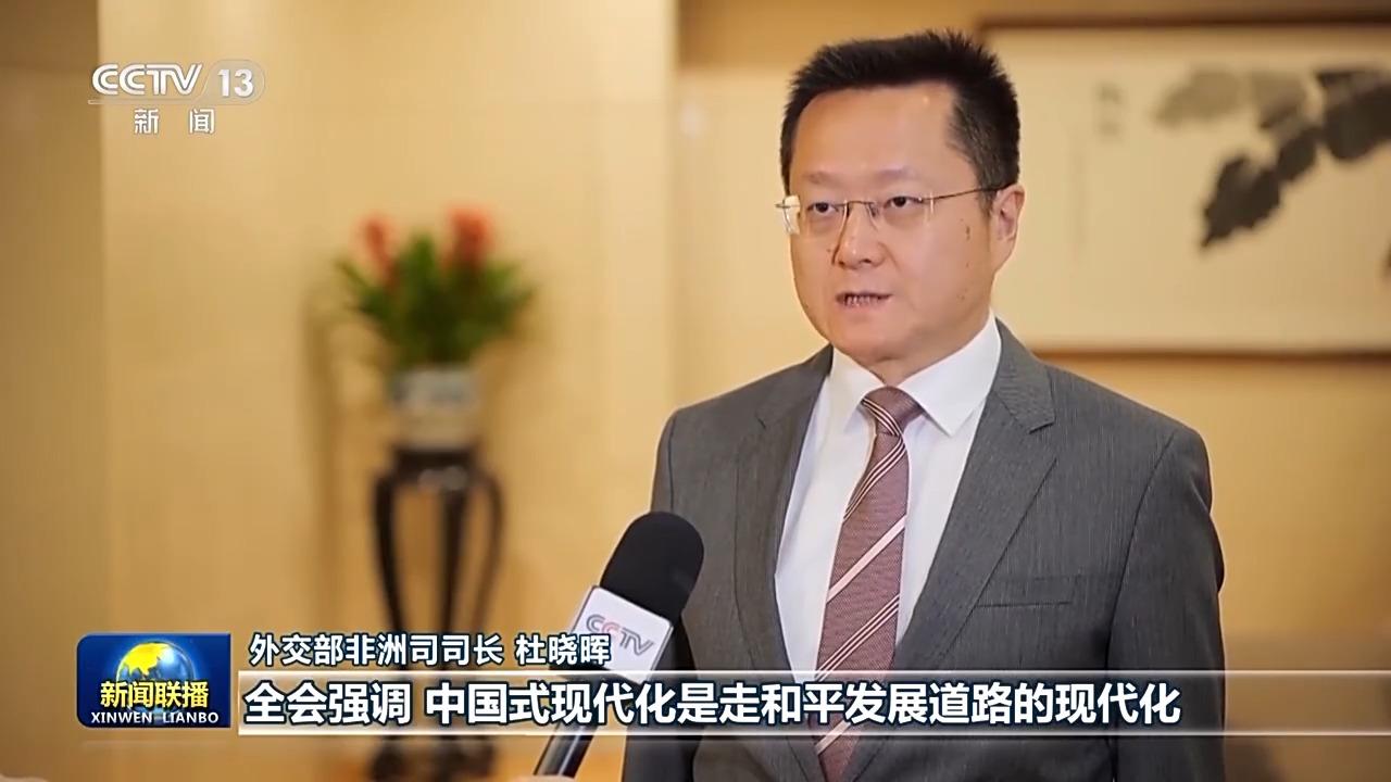 外交部非洲司司长 杜晓晖:全会强调,中国式现代化是走和平发展道路的现代化,开放是中国式现代化的鲜明标识。在百年变局加速演进、世界进入新的动荡变革期的大背景下,三中全会给世界注入和平力量、稳定力量、进步力量、发展力量。我们将以习近平外交思想为指引,坚定奉行独立自主的和平外交政策,推动构建人类命运共同体,为以中国式现代化全面推进强国建设、民族复兴伟业营造更有利国际环境、提供更坚实战略支撑。