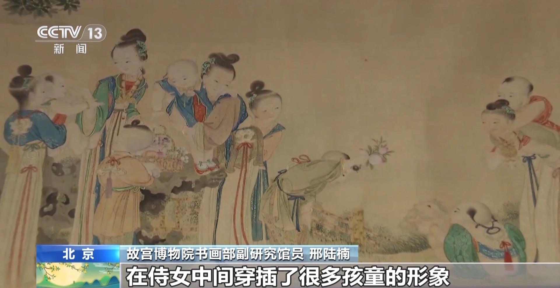 故宫博物院书画部副研究馆员 邢陆楠:画家在绘制的时候其实是非常用心的,他既还原了当时民间包括宫廷中这种拜月的习俗,也加入了很多喜庆、具有美好寓意的元素。