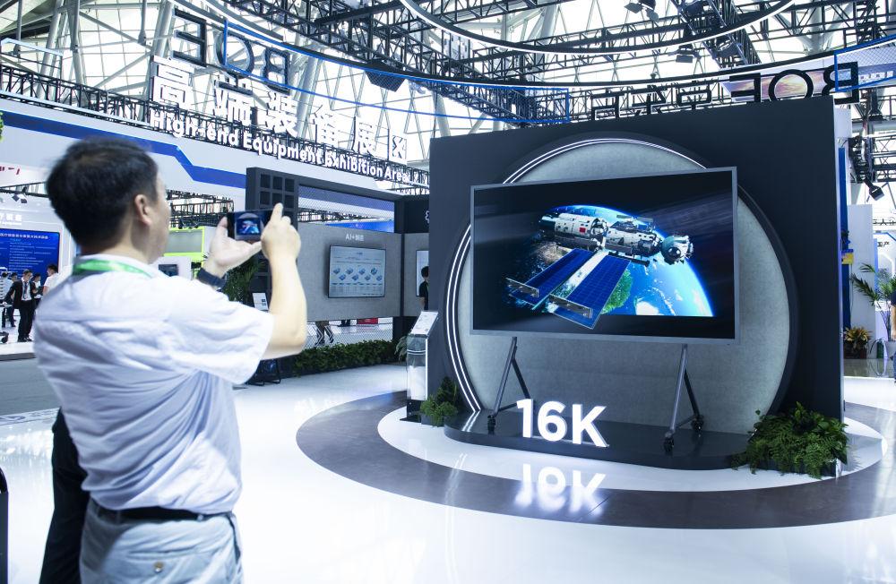 9月20日,观众在2024世界制造业大会展馆内了解16K裸眼3D屏幕。新华社记者 傅天 摄