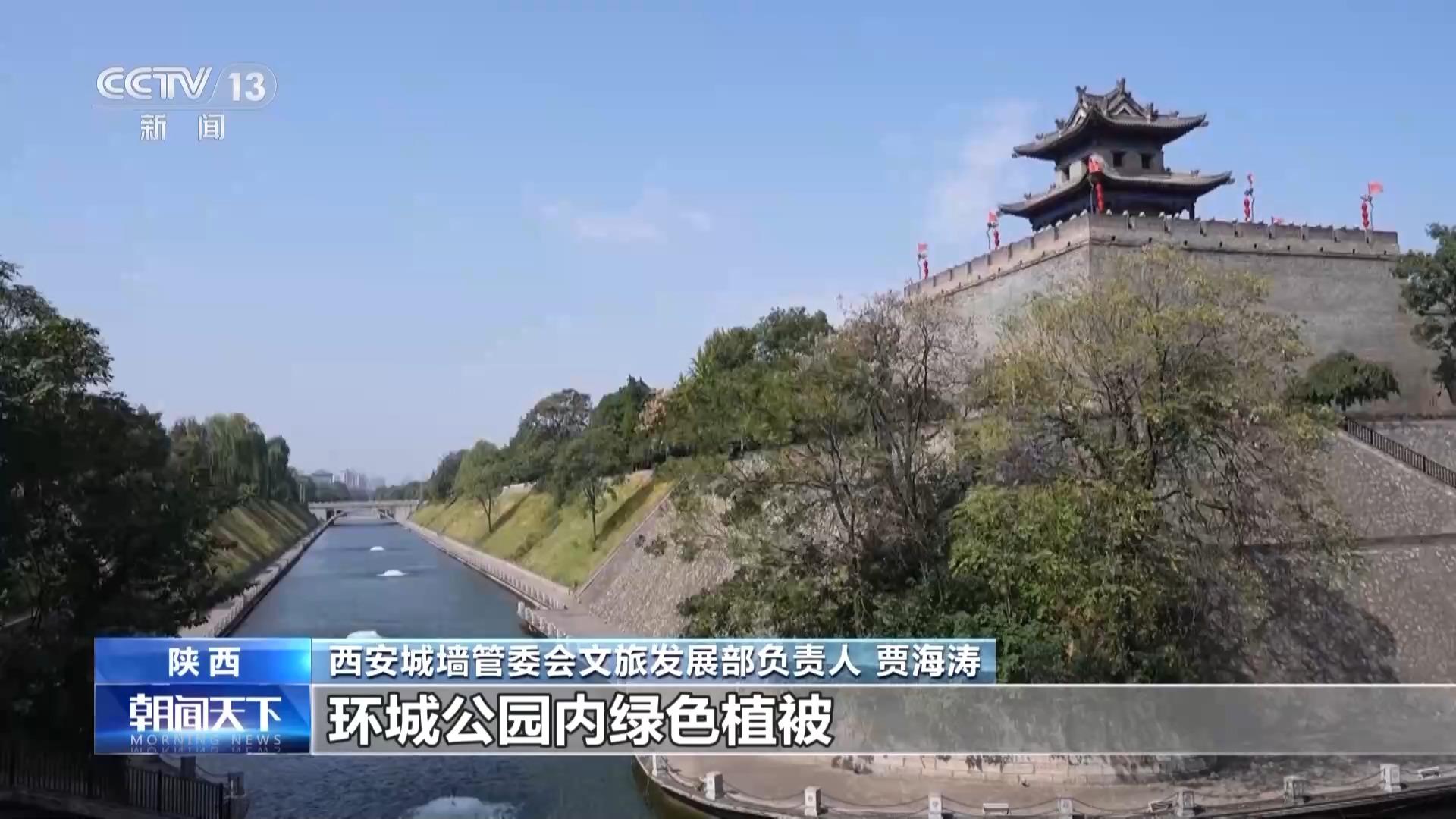 西安城墙管委会文旅发展部负责人 贾海涛:对护城河水体进行全面修复治理,改善和优化水体健康,环城公园内绿色植被达到了104.5万平方米,栽植水生植物2000余平方米。
