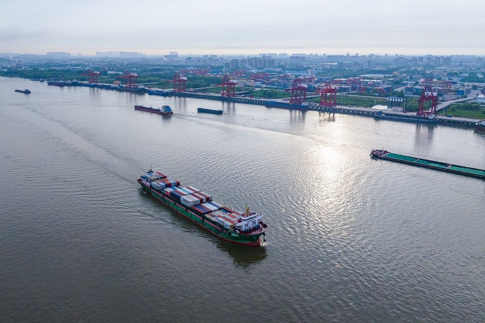 5月26日,在安徽芜湖港朱家桥港区国际集装箱码头,满载集装箱的货轮驶离码头。(肖本祥 摄)