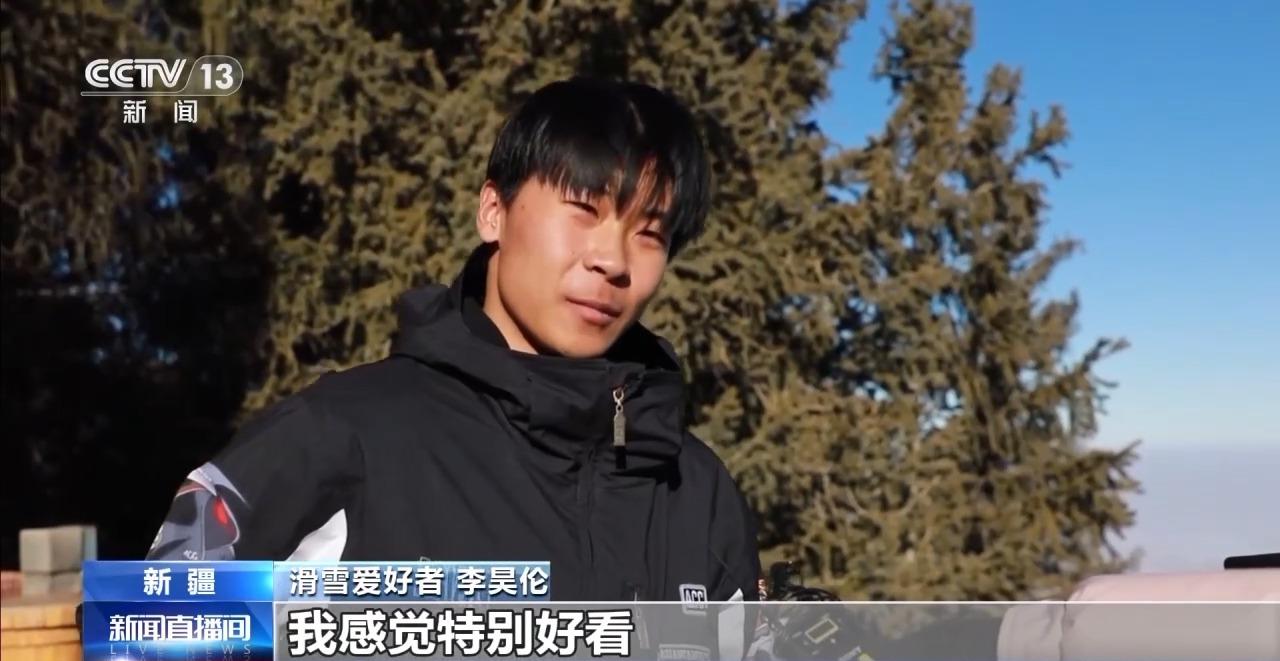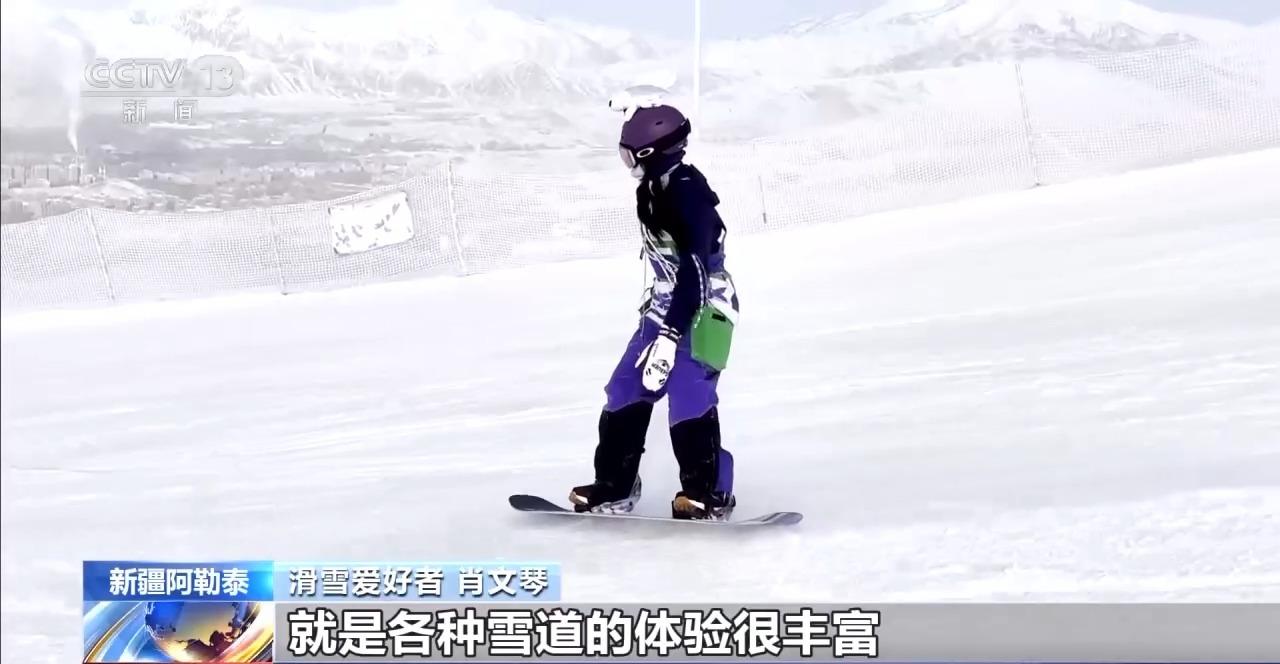 滑雪爱好者 肖文琴:阿勒泰这边的雪非常棒,在国内来说雪道很完善,各种雪道的体验很丰富,雪域面积也很大,雪质也很好。