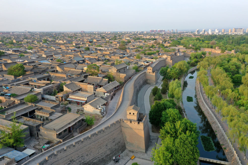 山西平遥古城城墙和护城河一角(2024年5月9日摄,无人机照片)。近年来,当地政府通过加固城墙、维护历史建筑、逐步建立古城违建整治长效机制等措施,使这座“活着的古城”散发新的生机。