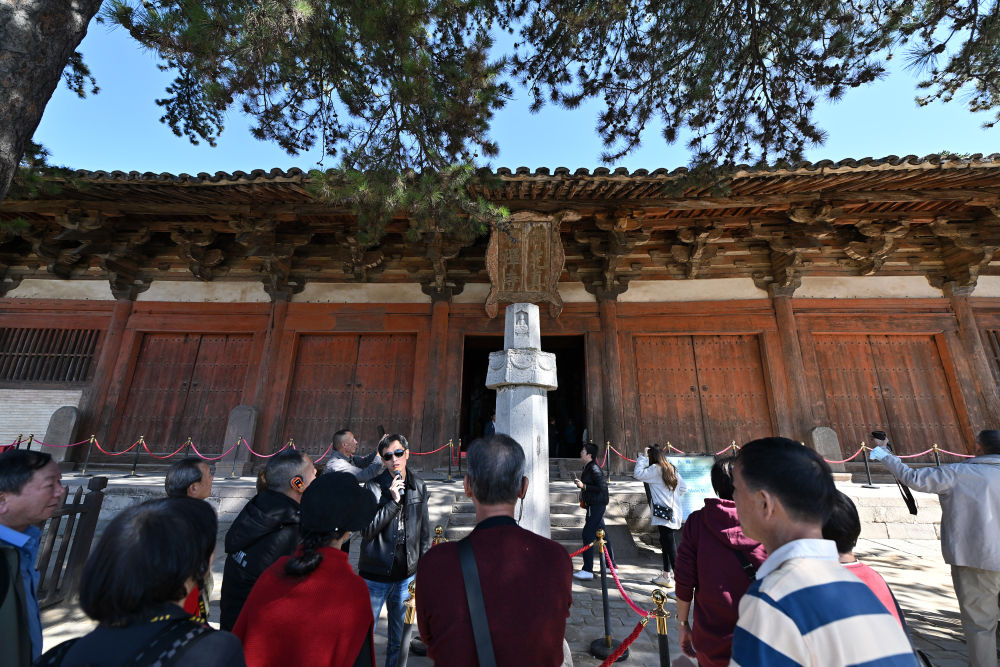 位于山西五台县的佛光寺东大殿,是我国现存珍稀唐代木结构建筑中规模最大、保存最完整的一座,也是世界文化遗产五台山的重要组成部分。这是2024年10月11日,游客在佛光寺东大殿参观。