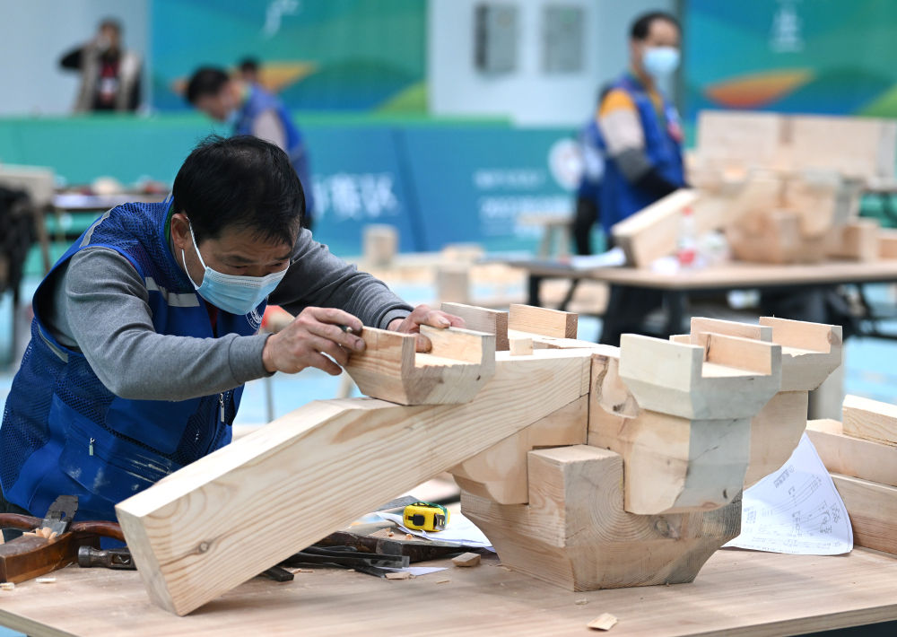 2023年3月25日,全国文物行业职业技能大赛在山西太原举行,全国两百余名选手现场比拼文物修复和考古探掘技术。这是参加木作文物修复师比赛项目的选手制作木质传统建筑构件。