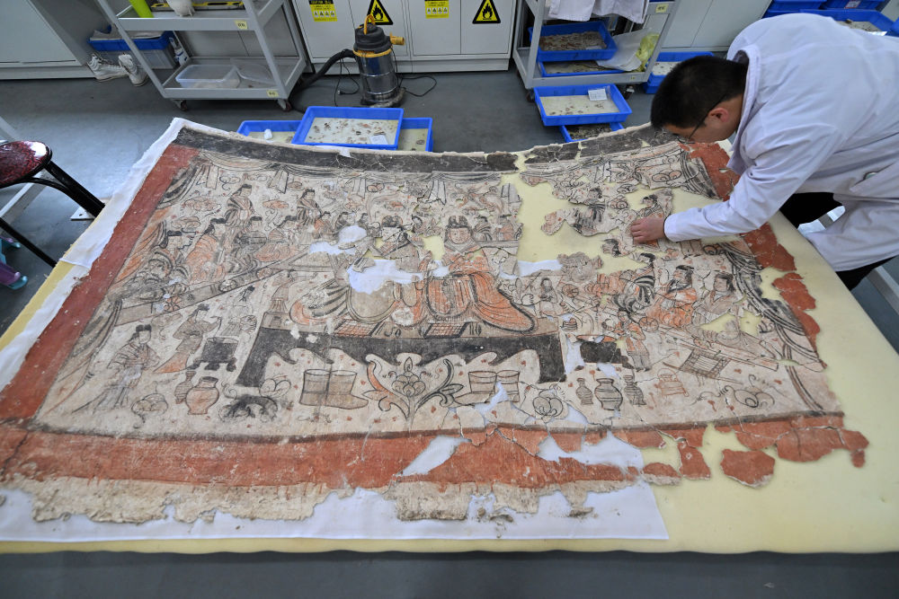 2024年2月27日,云冈研究院壁画文物修复室工作人员王建国在修复壁画。