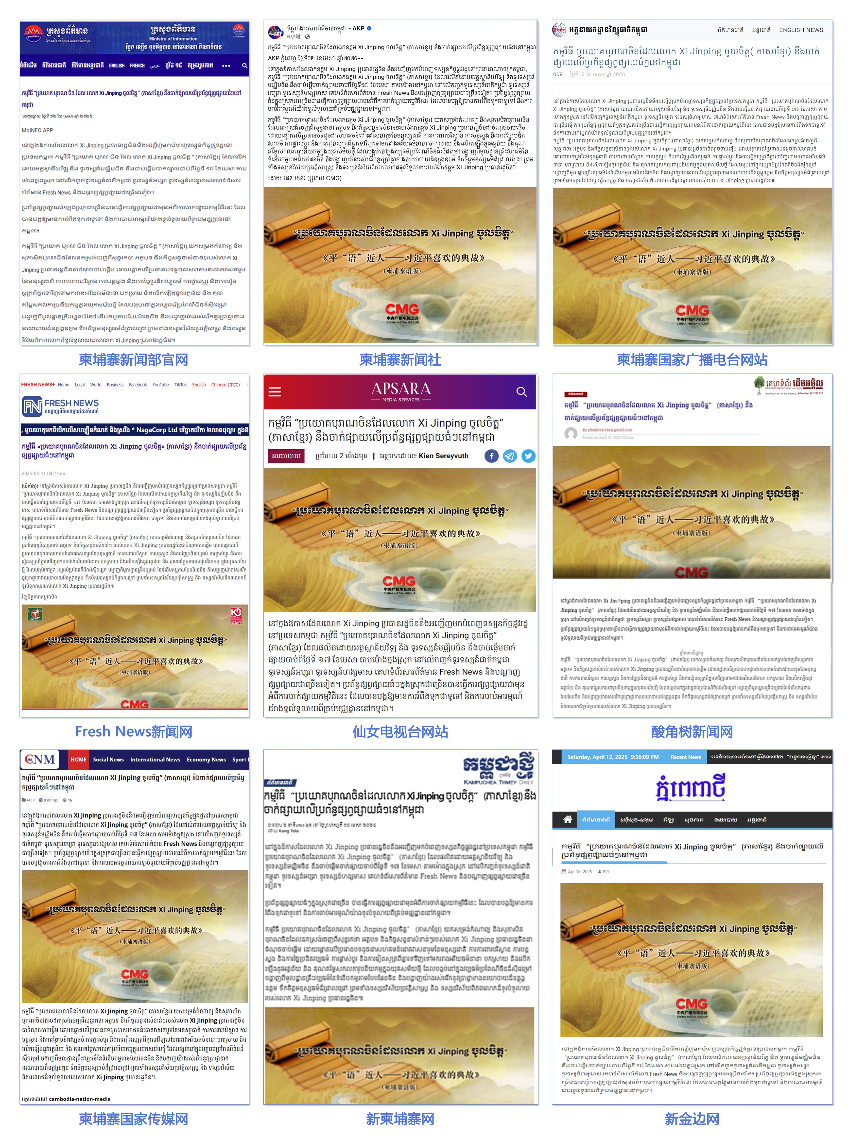 柬埔寨新闻部官网、柬埔寨新闻社、柬埔寨国家广播电台网站、Fresh News新闻网、仙女电视台网站、柬中记协网站、酸角树新闻网、柬埔寨国家传媒网、新柬埔寨网、新金边网、《金边日报》网等柬主流媒体发布相关报道。