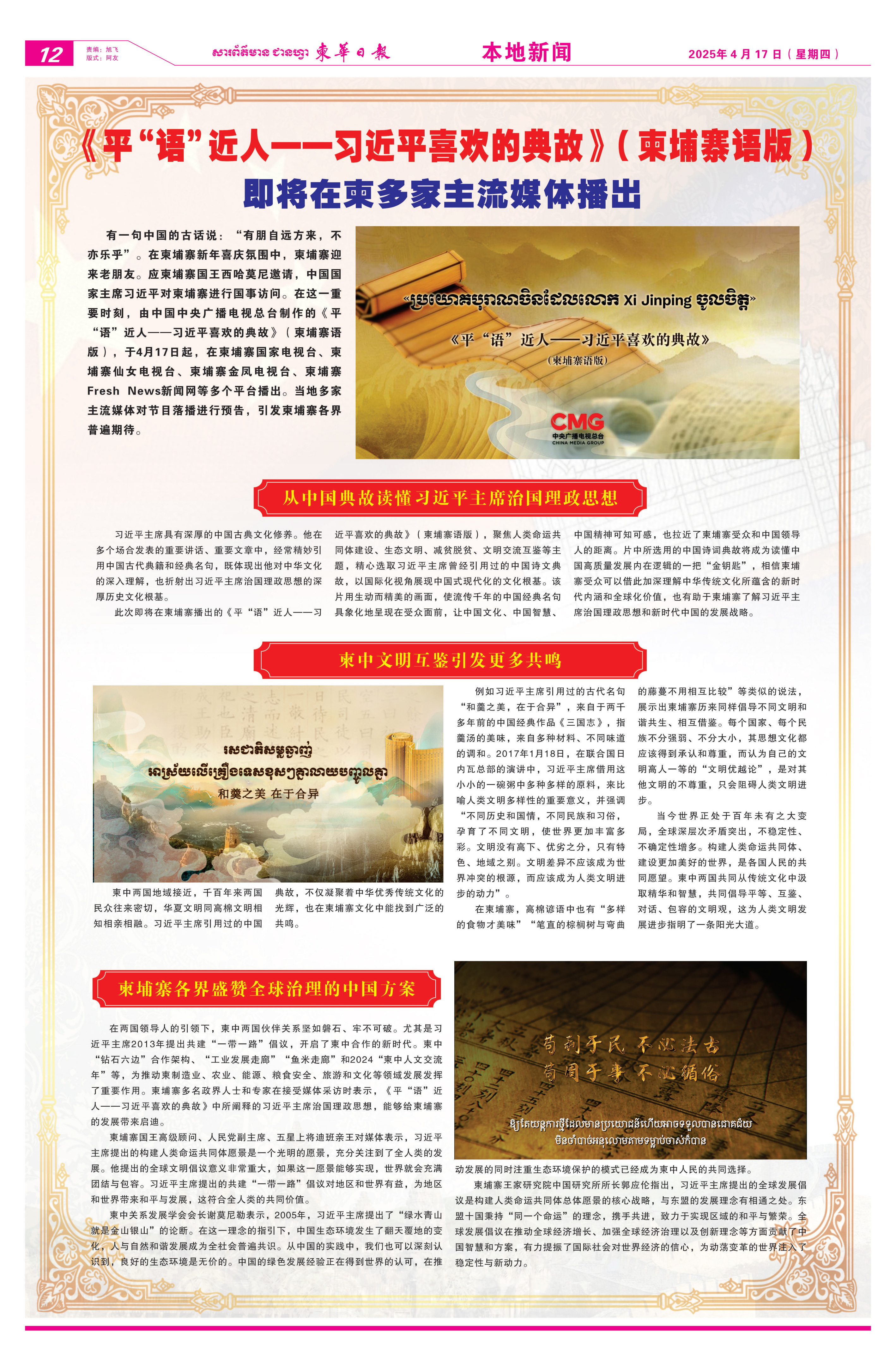 4月12日至17日,《柬华日报》《大都市报》等当地报纸刊发节目播出预告消息。文章指出,《平“语”近人——习近平喜欢的典故》(柬埔寨语版)是一把读懂中国高质量发展内在逻辑的“金钥匙”,相信柬埔寨受众可以通过这些中国古籍和经典名句加深理解中华优秀传统文化所蕴含的新时代内涵和全球化价值,了解习近平主席治国理政思想和新时代中国的发展战略。