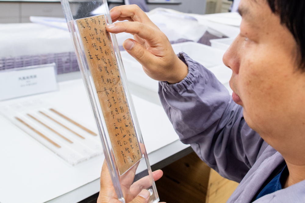 2023年5月20日,湖北荆州文物保护中心的修复人员史少华在查看修复完成的简牍。荆州文物保护中心是我国简牍修复领域实力最强的机构之一,近年来累计完成13万多枚竹木简牍的脱水工作,饱水简牍修复量占全国90%以上。