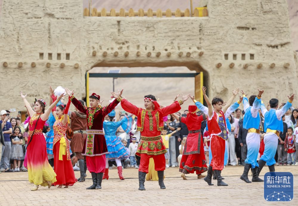 ↑ 5月4日,演员在新疆吐鲁番市鄯善县吐峪沟景区表演民族歌舞。