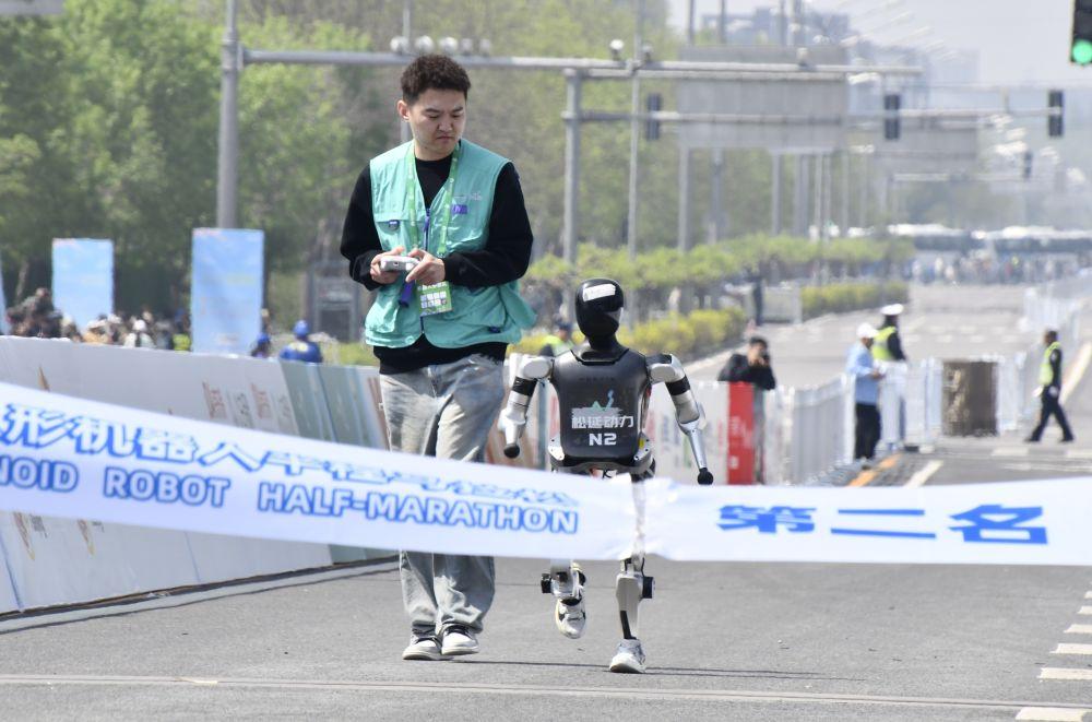 4月19日,在2025北京亦庄半程马拉松暨人形机器人半程马拉松比赛中,小顽童队选手松延动力N2(右)冲向终点。新华社记者李欣 摄