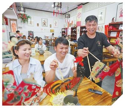 在江西省萍乡市安源区南正街历史文化街区皮影戏馆,游客在皮影戏传承人(右一)指导下体验传统文化,感受非遗项目的魅力。