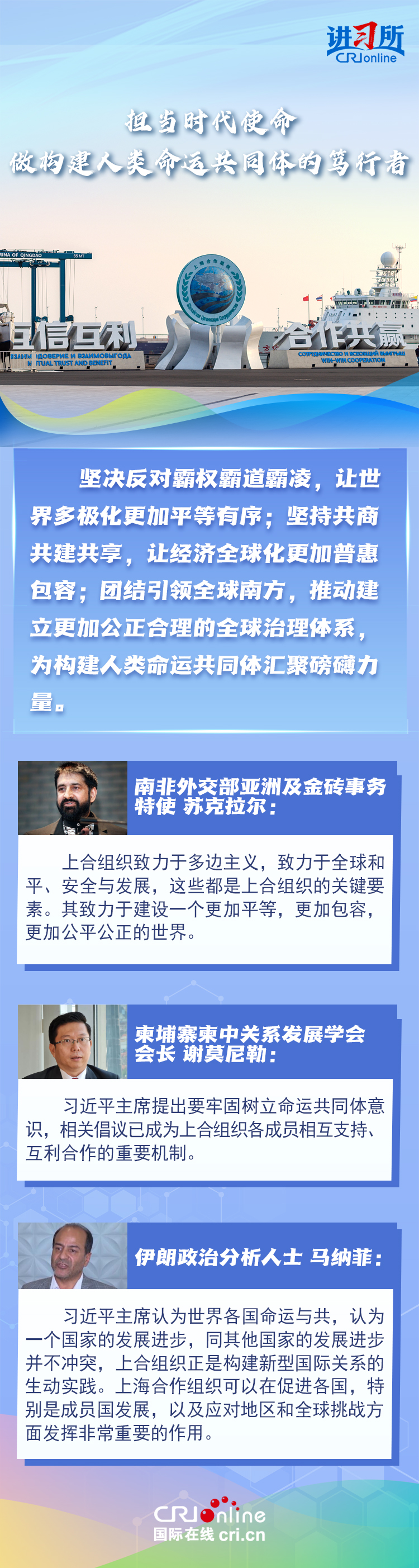 “让‘上海精神’持续照亮构建上海合作组织命运共同体之路。”上海合作组织成立24年来,始终秉持“上海精神”,成功走出了一条顺应时代潮流、契合各方需求的区域合作道路,树立起新型国际关系的典范。在国际人士眼中,上海合作组织站在历史正确一边,致力于建设一个更加平等,更加包容,更加公平公正的世界,对维护地区和全球和平至关重要。