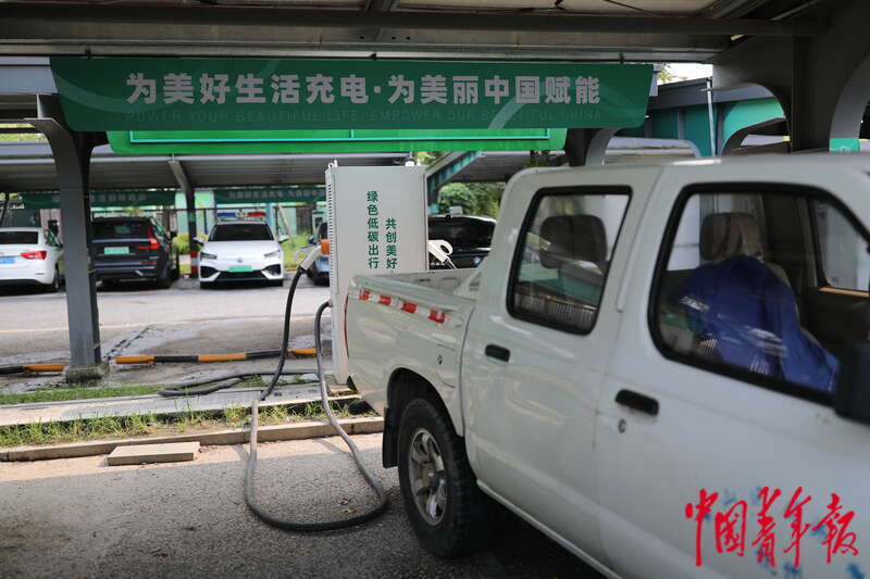 8月4日,中青报·中青网记者参加“活力中国调研行”主题采访时来到梅林村光充储一体化充电站,该站标语写着“为美好生活充电·为美丽中国赋能”。中青报·中青网记者 孔斯琪/摄