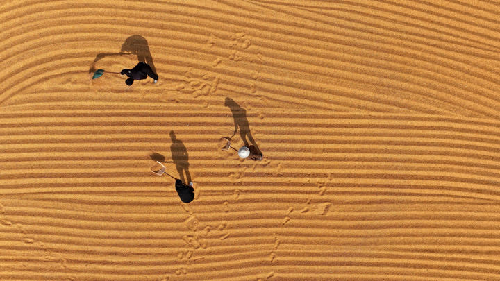 2025年10月28日,在山东省枣庄市市中区税郭镇,农民晾晒收获的玉米(无人机照片)。新华社发(孙中喆 摄)