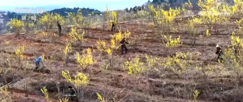 在山西省安泽县青松岭,这里的连翘进入盛花期。从空中俯瞰,连片的金色花海与蓝天白云、青山绿树相映成趣,蔚为壮观。春日暖阳下,农户们抓紧春管关键期进行剪枝平地。
