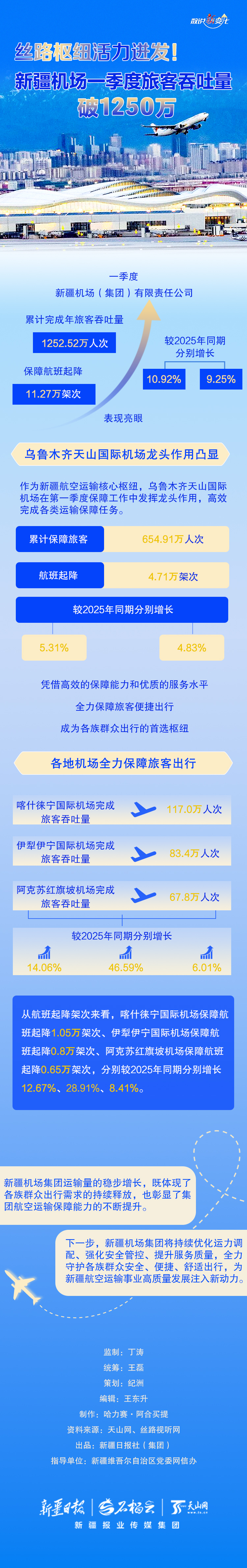 一季度,新疆机场(集团)有限责任公司累计完成年旅客吞吐量1252.52万人次,保障航班起降11.27万架次,较2025年同期分别增长10.92%和9.25%,表现亮眼。一季度,新疆各机场完成多少旅客吞吐量?较去年增长多少?今天的《数说“新”变化》一起来看看。