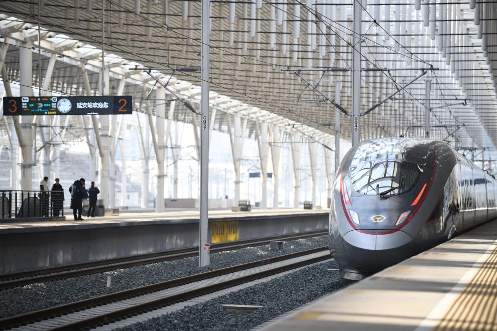 2025年12月26日,西延高铁首发列车从延安站驶出。新华社记者 张博文 摄