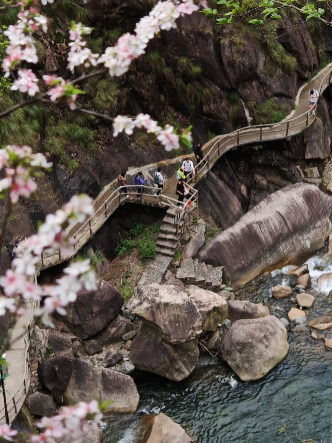 春日的徽杭古道,堪称人间仙境。3月下旬至5 月,漫山杜鹃从岩缝中绽放,粉紫、绯红缀满山间,与苍松翠竹相映成趣。