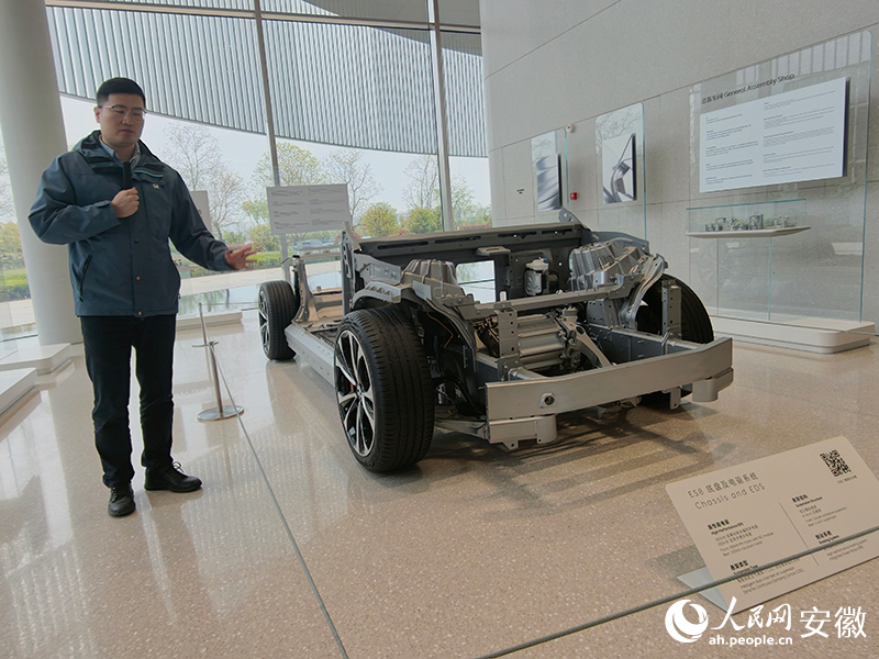 蔚来汽车工作人员介绍车辆底盘及电驱系统。人民网 陶伟摄
