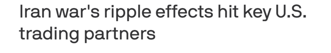 自美以发动对伊朗的军事行动以来,美政府一直通过强调自身“石油储备充足”来竭力弱化战事对自身经济的冲击,对冲民众的反战情绪。但美国阿克西奥斯新闻网16日的报道似乎从另一个角度对这种论调进行了回应。报道关注了伊朗战事的连锁效应如何波及美国关键贸易伙伴,进而推高相关产品价格,导致供应短缺,并最终冲击美国经济。