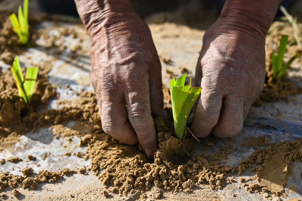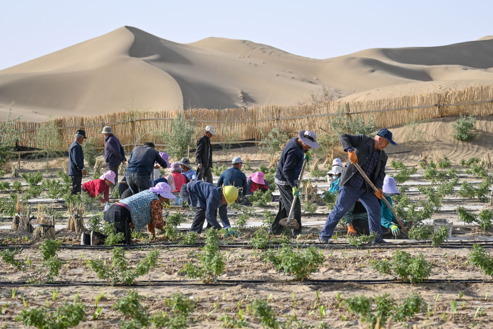 眼下,新疆塔克拉玛干沙漠南缘一派繁忙景象。人们平整沙丘、铺设草方格、嫁接苗木、栽种中药材……塔克拉玛干沙漠边缘治沙正酣。