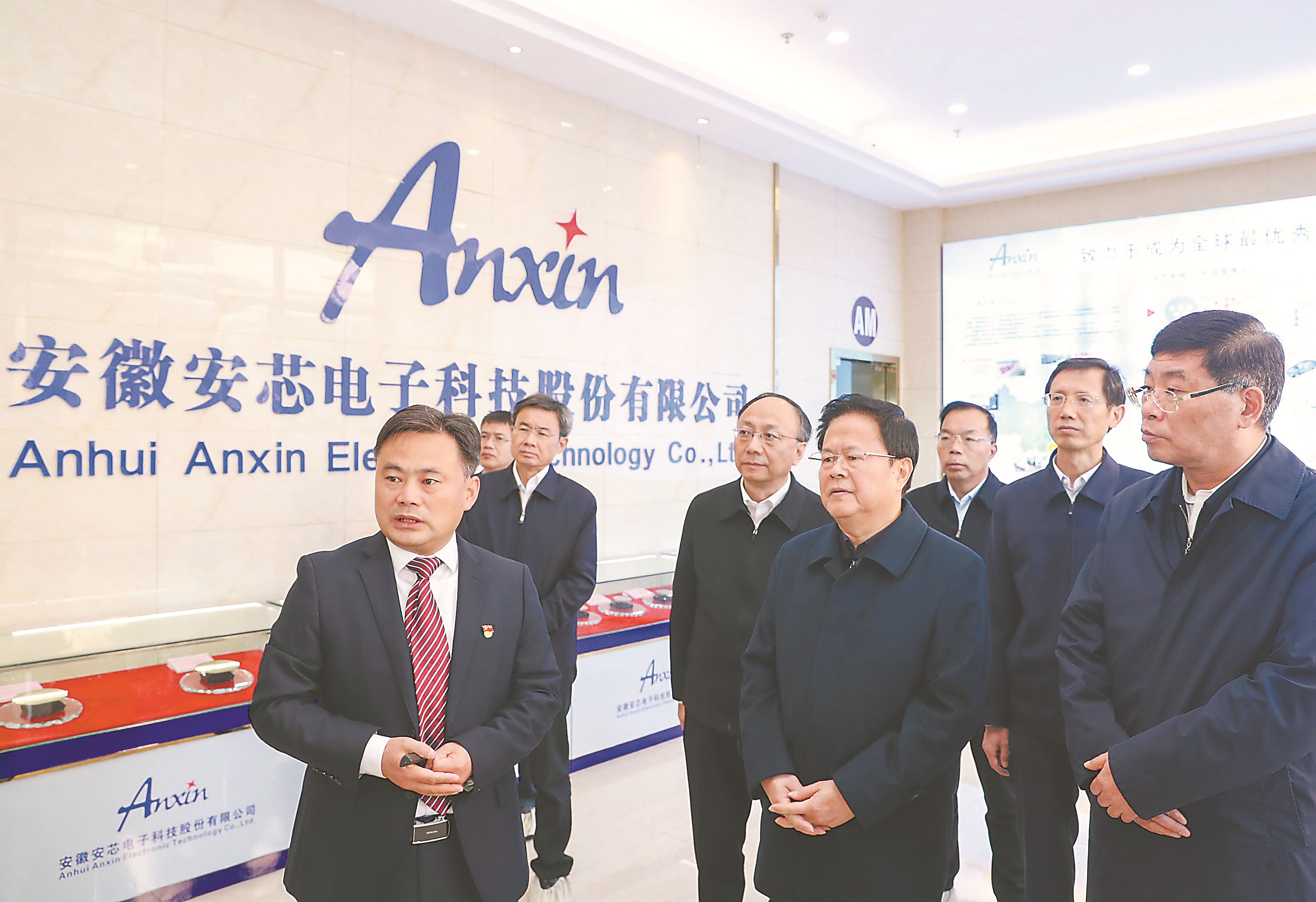 池州华宇电子科技公司是一家主要从事集成电路封装测试的专精特新企业。郑栅洁仔细察看企业产品、考察生产车间,了解企业发展规划。“客户主要有哪些?”“技术创新处于行业什么水平?”郑栅洁不时插话询问,鼓励企业按照经济规律组织技术创新、产品创新、工艺创新、流程创新和管理创新,加强产业链供应链生态建设,不断提升生产效率和亩均效益。随后,郑栅洁走进安芯电子科技公司,深入调研了解企业生产、销售及产业布局等情况,对企业“把不可能变成可能,把理想变成现实”的开拓奋进精神表示赞许。他说,半导体芯片广泛应用于汽车、家电等领域,市场空间广阔,企业要激发内生动力,加强技术研发和市场开拓,迅速做大做强;地方要强化服务,为企业发展壮大营造良好营商环境。