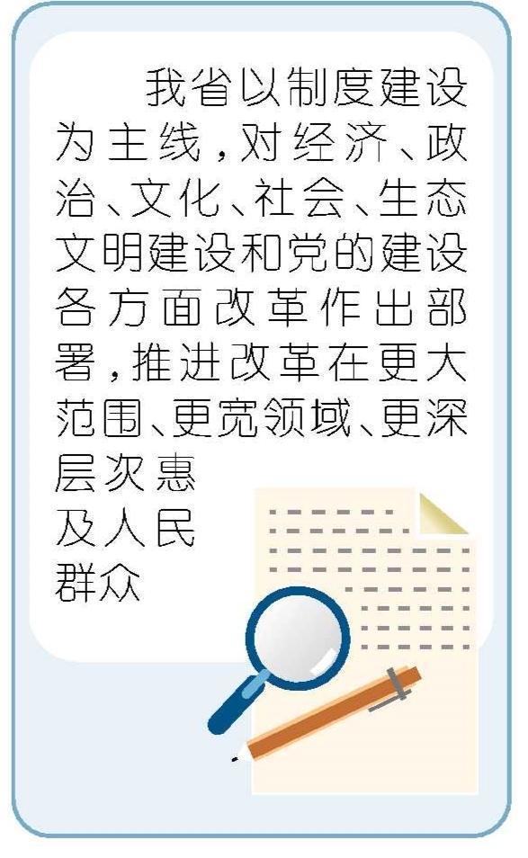 我省以制度建设为主线,对经济、政治、文化、社会、生态文明建设和党的建设各方面改革作出部署,推进改革在更大范围、更宽领域、更深层次惠及人民群众: