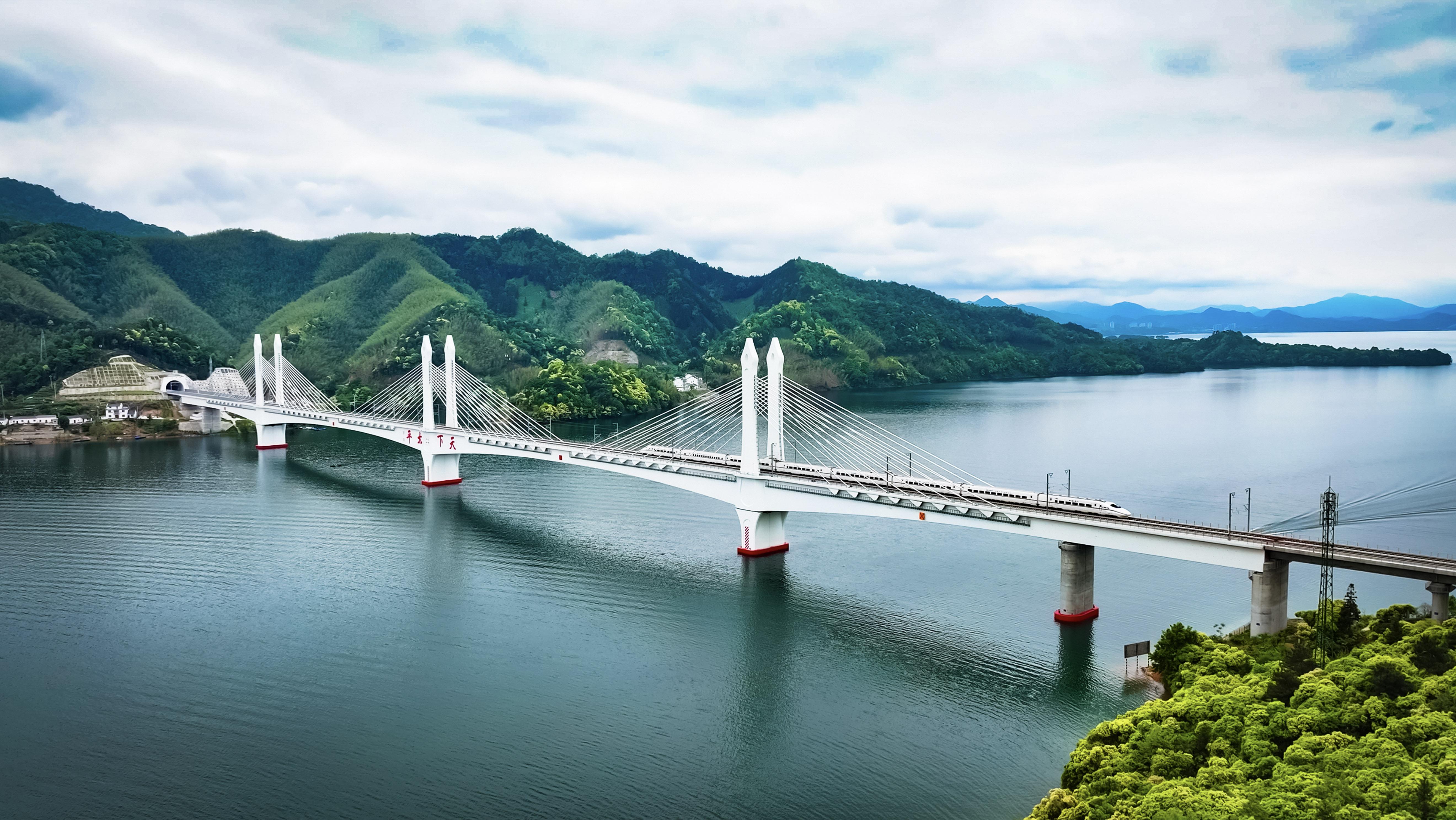 池黄高铁调试列车穿桥而过。池黄高铁联接杭昌高铁,对助力长三角一体化发展具有十分重要的意义。(资料图片)