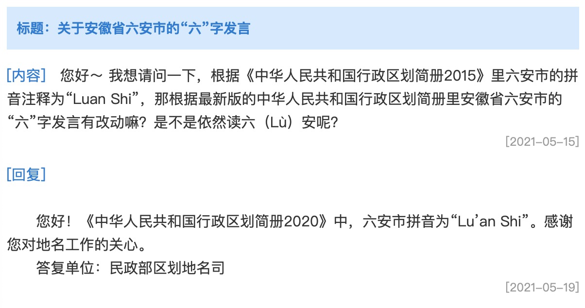 5月15日,有网友在民政部门户网站留言咨询安徽省六安市的“六”字发音问题:“根据《中华人民共和国行政区划简册2015》里六安市的拼音注释为‘Luan Shi’,那根据最新版的中华人民共和国行政区划简册里安徽省六安市的‘六’字发言有改动嘛?是不是依然读六(Lù)安呢?”