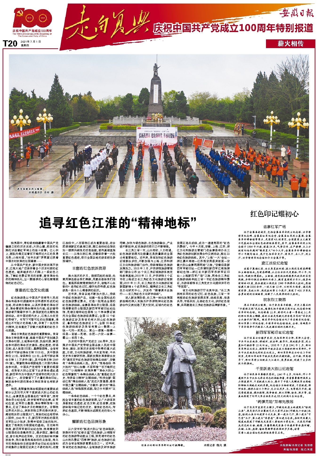 从中国共产党史、新中国史到改革开放史,江淮大地广泛保存着各个历史时期的红色遗迹,越来越多的人们踏上一段红色之旅,了解红色景区背后的故事,接受革命先烈的精神洗礼,让一颗澎湃的心留住激情燃烧的红色记忆。