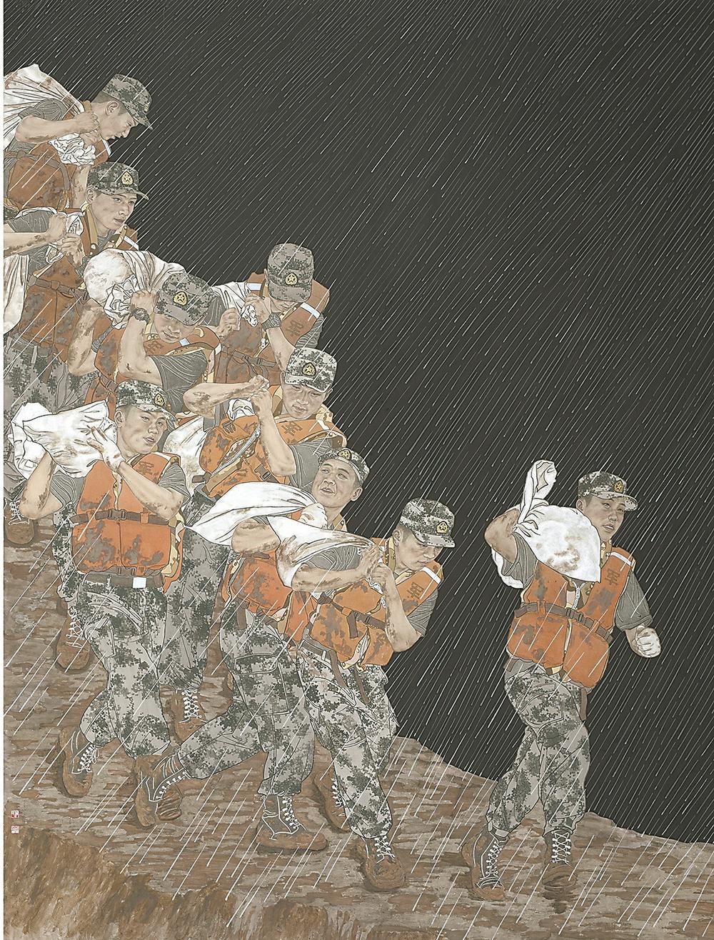 铁甲抗洪(国画) 何小玲