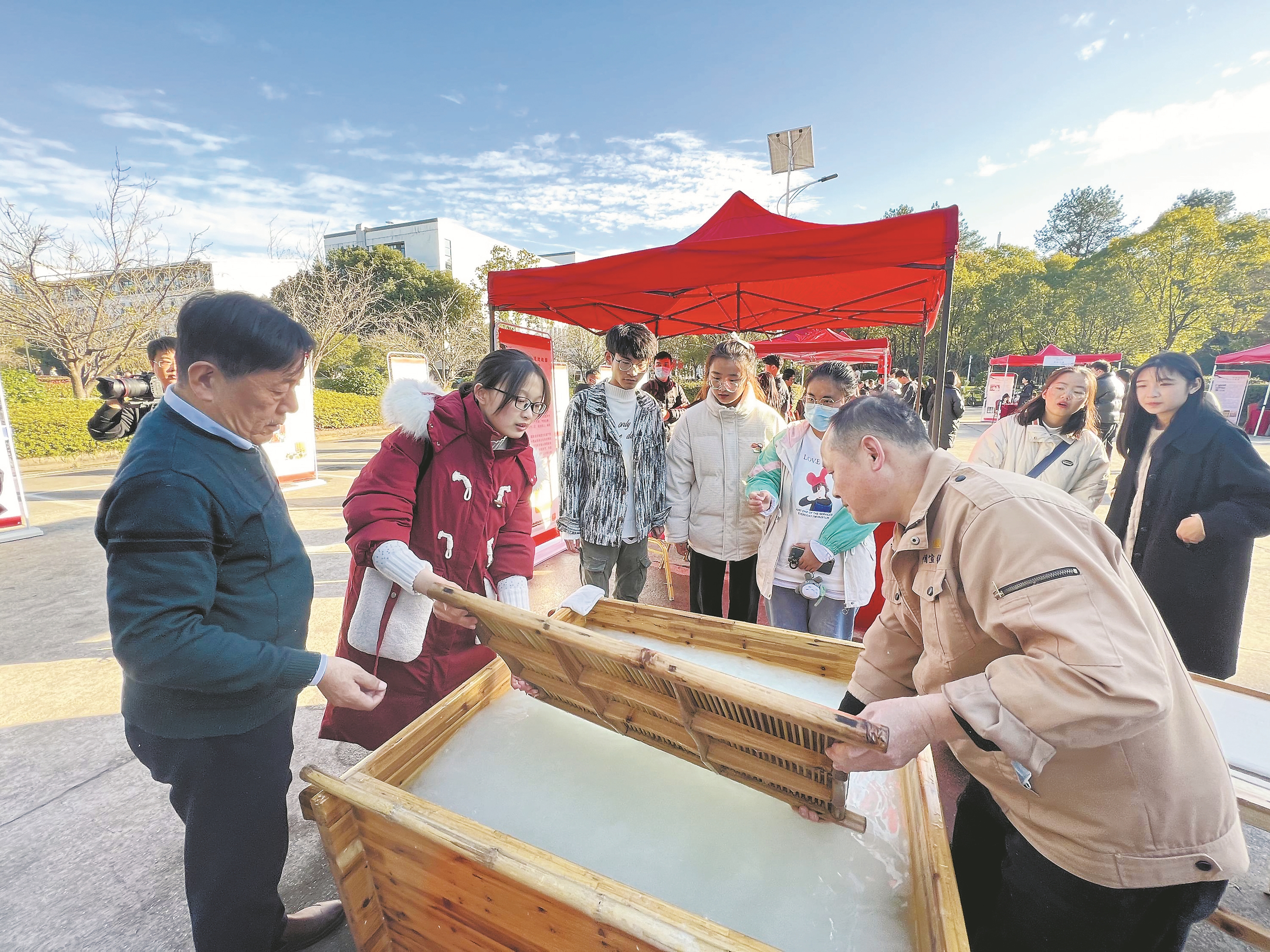 当天下午,黄山学院邵逸夫图书馆广场人头攒动、热闹非凡,文房四宝、徽州三雕、庐州内画、阜阳剪纸、皖南皮影戏、青阳农民画等展台环绕四周,12位国家级、省级非遗代表性传承人各展绝活,吸引了众多学生观摩互动,现场洋溢着浓浓的青春气息和文化味。