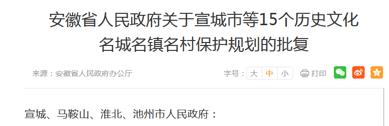 据安徽省人民政府网消息,近日,安徽省人民政府关于宣城市等15个历史文化名城名镇名村保护规划的批复发布。