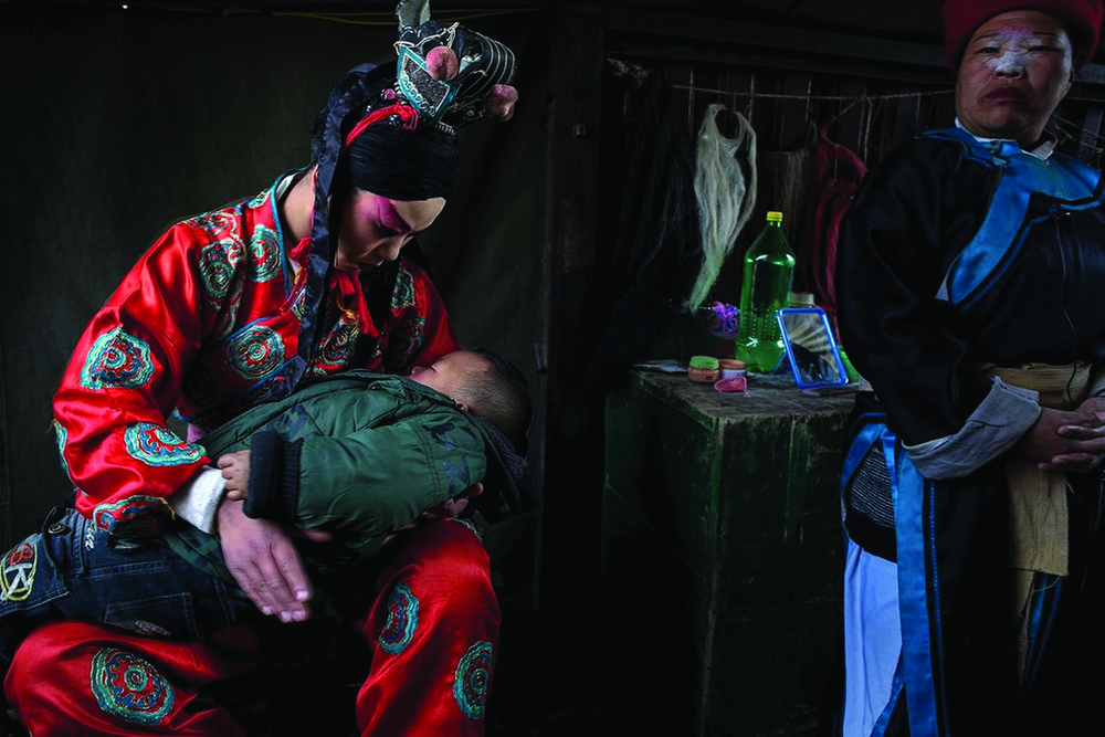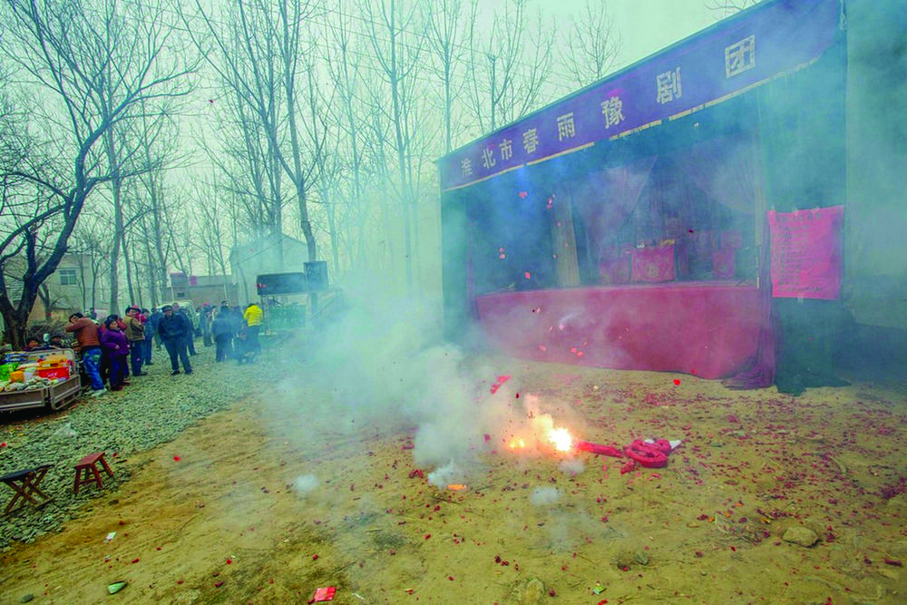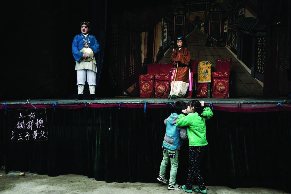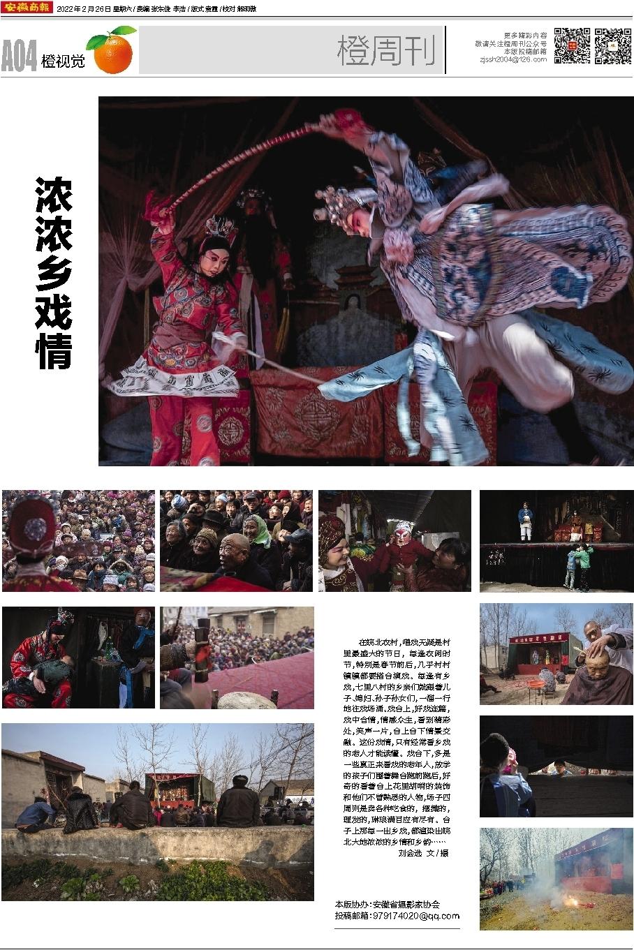 在皖北农村,唱戏无疑是村里最盛大的节日,每逢农闲时节,特别是春节前后,几乎村村镇镇都要搭台演戏。每逢有乡戏,七里八村的乡亲们就跟着儿子、媳妇、孙子孙女们,一溜一行地往戏场涌。戏台上,好戏连篇,戏中含情,情感众生,看到精彩处,笑声一片,台上台下情景交融。这份戏情,只有经常看乡戏的老人才能读懂。戏台下,多是一些真正来看戏的老年人,放学的孩子们围着舞台跑前跑后,好奇的看着台上花里胡哨的装饰和他们不曾熟悉的人物,场子四周则是卖各种吃食的,摆摊的,理发的,琳琅满目应有尽有。台子上那每一出乡戏,都渲染出皖北大地浓浓的乡情和乡韵……