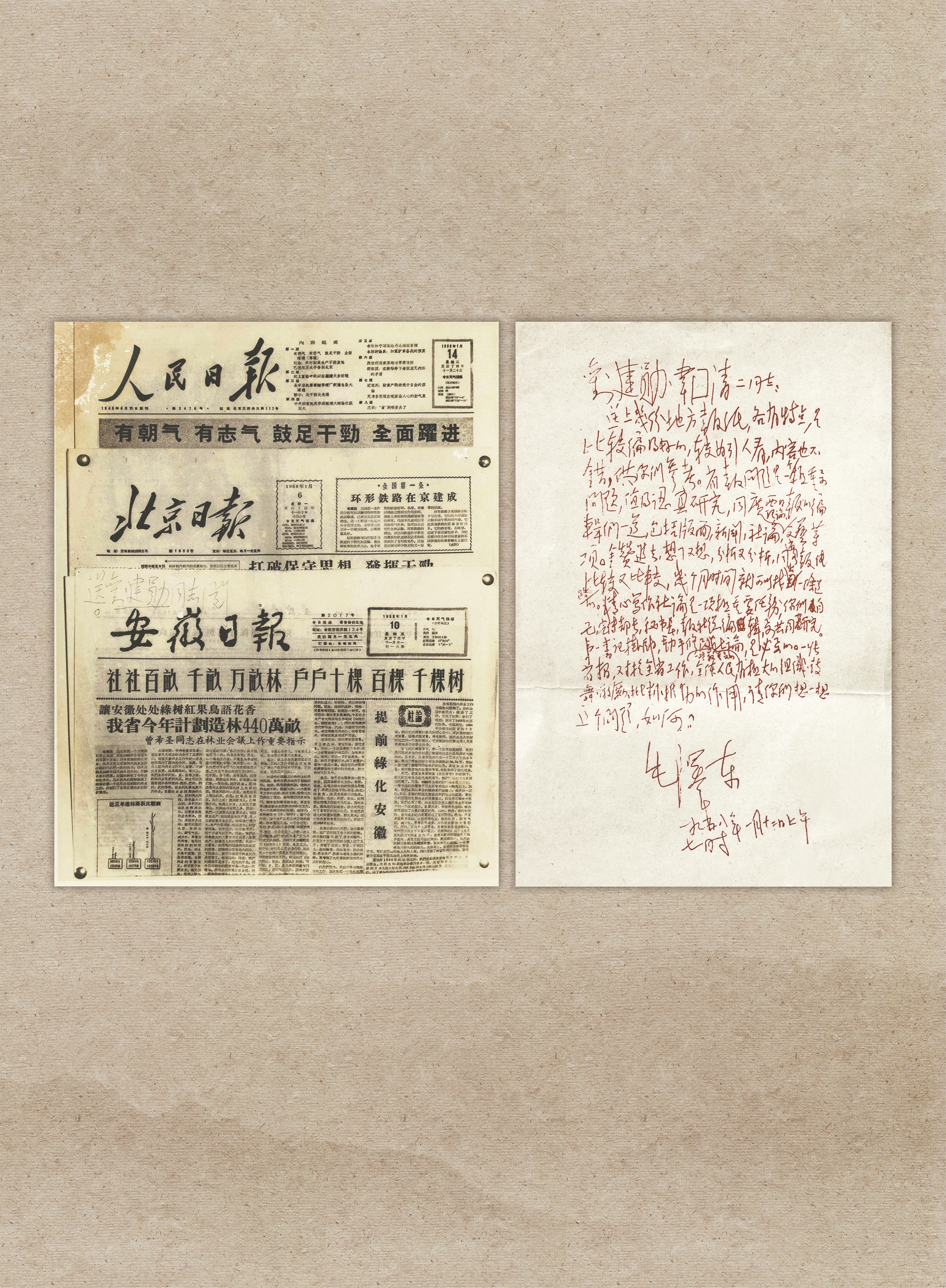 谈谈毛泽东同志称赞《安徽日报》的故事,先从1958年1月12日,毛泽东同志写信给时任广西省委第一书记刘建勋和广西省委书记处书记、广西省省长韦国清说起。毛泽东在信中写道:“送上几份地方报纸,各有特色,是比较编得好的,较为引人看,内容也不错,供你们参考。”毛泽东同志提到的几份报纸中,就包括1958年1月10日的《安徽日报》“植树造林”专版。