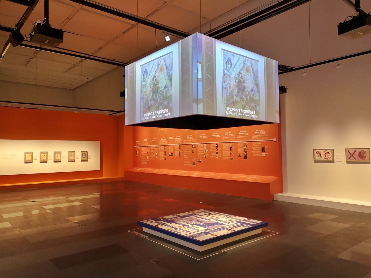 1号展厅。马克·夏加尔是1887年出生在白俄罗斯的法国画家,是西方现代绘画史上的史诗级艺术家。展览展现夏加尔1956—1972年间创作的75件石版画,包括《罗密欧与朱丽叶》《凤凰艺术家》《革命》《春日》《半人马的母亲》等重点作品,并运用数字媒体拓展经典作品的多维度感官体验。