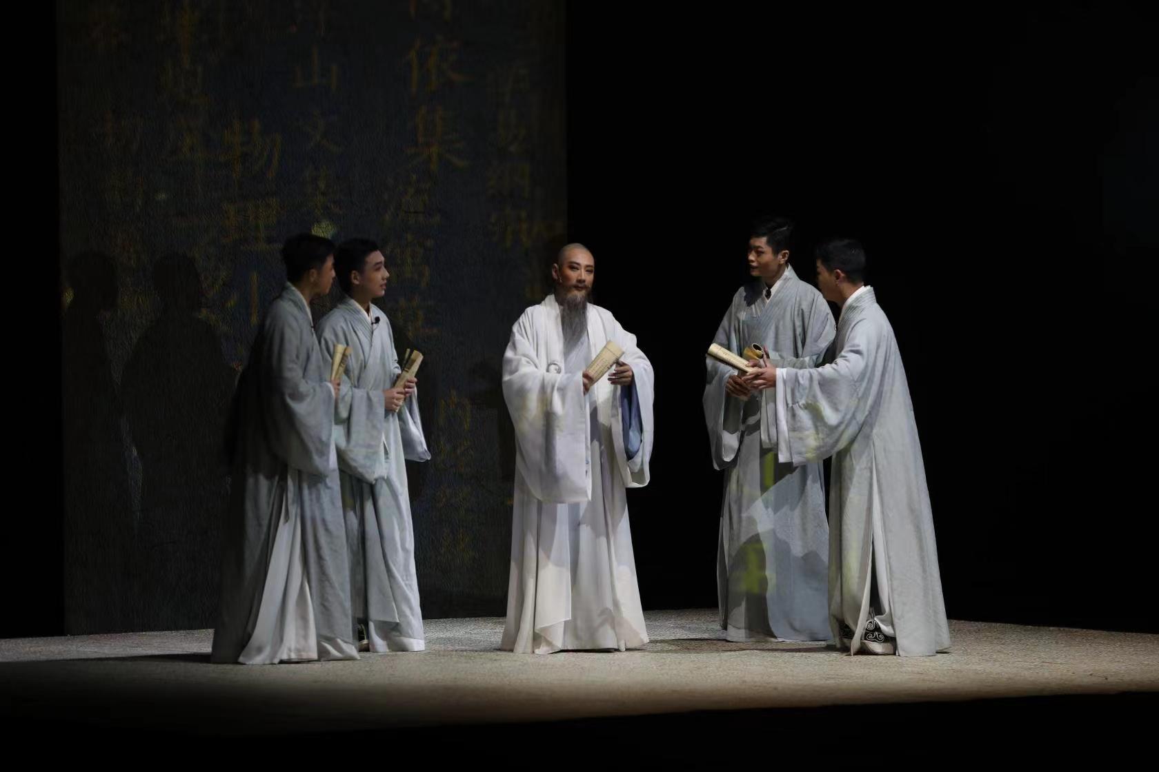方以智,字密之,明末清初著名思想家、文学家、科学家,自幼秉承家学,博览群书,在哲学、训诂、医学、自然科学、诗文、书画艺术等诸多领域成就斐然,被誉为十七世纪“中国百科全书式人物”。反映方以智不凡事迹和精神的这部原创黄梅戏,除序幕外,分设《流离草》《宝刀行》《天地孤》《归去来》四幕,层层推进,高潮迭起。在尊重历史真实的前提下,该剧以丰沛而浪漫的想象力,以引人入胜的故事情节,别开生面地塑造了一代学人方以智的高风亮节与感人至深的艺术形象,再现了风雨飘摇的易代之际,方以智一腔孤勇,决绝向前,为救世、图复兴,虽历经劫难,家国情怀始终不改,其“为天地立心、为生民立命、为往圣继绝学”的志向愈发坚定,并在绝境中悟出要复兴“政治清明、科学昌明、礼仪文明”的堂堂中华,以求“天下归仁”,为此他勠力合璧中西,会通儒释道,博采众长,著书立说不已,为后世留下皇皇著作,播下可贵的精神火种。整部剧目综合运用多种艺术表现手段,熔思想性、艺术性和观赏性于一炉。演员们表演比较细腻,动作与情感到位,比较精准地把握了人物性格和形象定位,看点、燃点与泪点交融,情味、韵味和余味无穷。