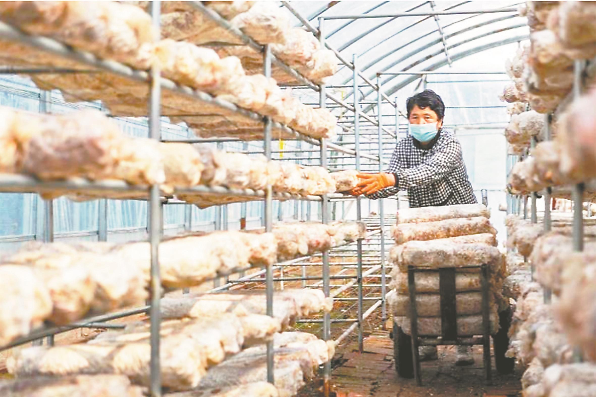 村民在村里的蘑菇大棚工作。受访者供图