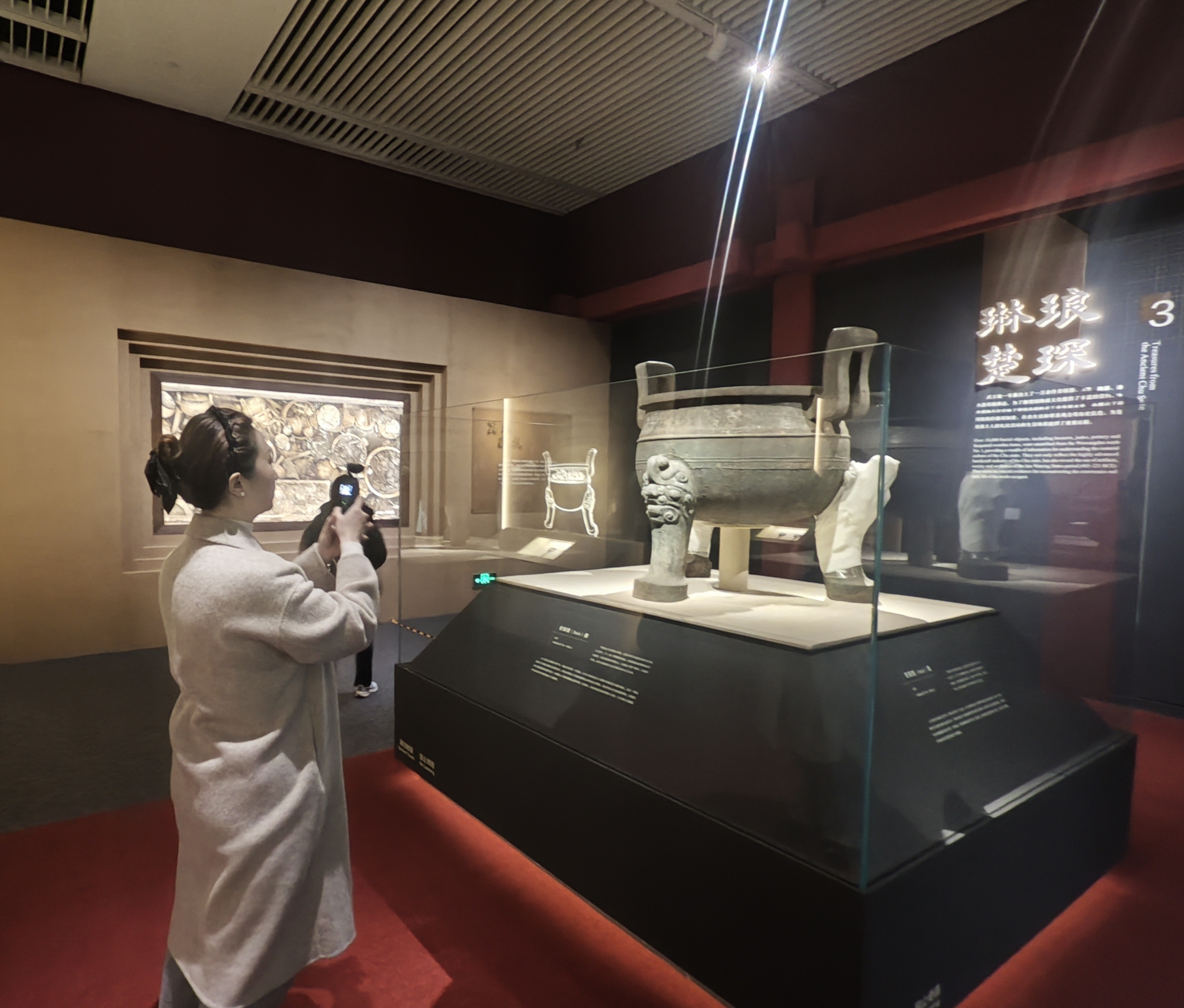 一尊巨大雄浑的青铜镬鼎,一件彩绘龙凤纹漆木案,一套保存完好的青铜编钟……1月18日,来自陕西的游客韩娟来到中国国家博物馆,饶有兴致地参观了安徽淮南武王墩一号墓考古成果展,被眼前珍贵的楚王墓出土文物所震撼。