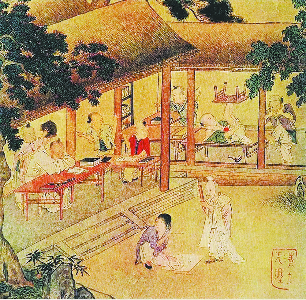 画面人物为一个老师和八个学生。画作虽有戏谑色彩,但通过在老师眼皮底下学生的“张狂”,反衬出老师与学生的亲近,他们既是师生,也是没有大小的朋友。想象一下,如果老师不是一个平易近人的温和先生,再狂妄的学生也不敢在老师睡觉时如此放肆,师生能处到如此地步,是学生之幸,也是老师之福。